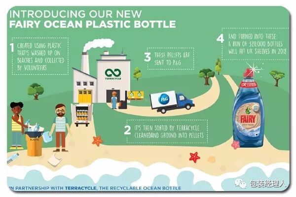 为提高消费者对海洋塑料回收的意识,宝洁公司将在英国推出32万个Fairy海洋回收塑料瓶,并鼓励消费者对沙滩塑料进行回收。