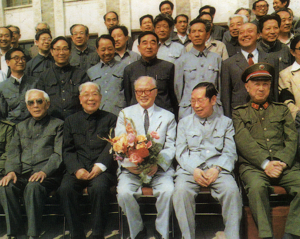王淦昌院士(中)八十岁生日祝贺会后的合影。前排左起:周培源,严济慈